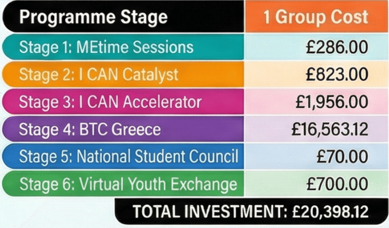 Recommended Delegate Group Package: £16,563 for 1 teacher, 5 youth and 1 employee volunteer.